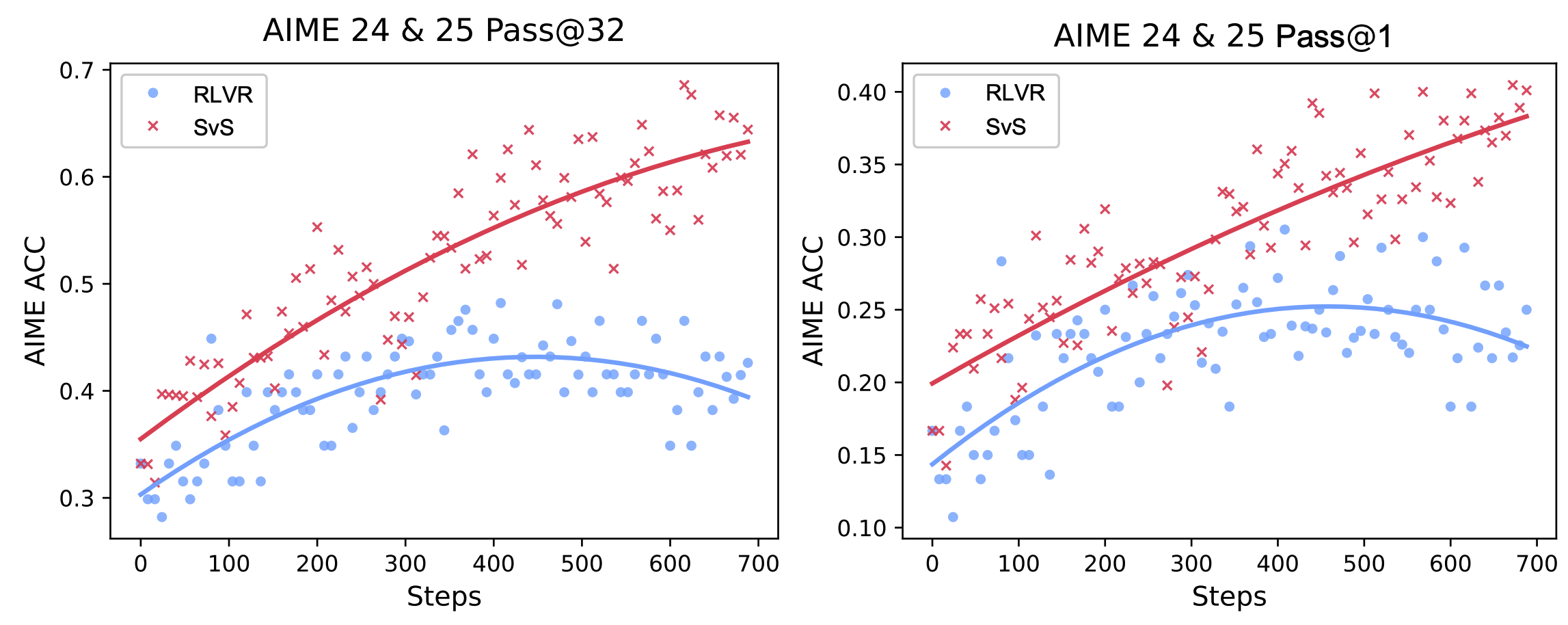 Reinforcement Learning with Verifiable Rewards (RLVR) has recently emerged as a key paradigm for post-training Large Language Models (LLMs), particularly for complex reasoning tasks. However, vanilla RLVR training has been shown to improve Pass@1 performance at the expense of policy entropy, leading to reduced generation diversity and limiting the Pass@k performance, which typically represents the upper bound of LLM reasoning capability. In this paper, we systematically analyze the policy’s generation diversity from the perspective of training problems and find that augmenting and updating training problems helps mitigate entropy collapse during training. Based on these observations, we propose an online Self-play with Variational problem Synthesis (SVS) strategy for RLVR training, which uses the policy’s correct solutions to synthesize variational problems while ensuring their reference answers remain identical to the originals. This self-improving strategy effectively maintains policy entropy during training and substantially improves Pass@k compared with standard RLVR, sustaining prolonged improvements and achieving absolute gains of 18.3% and 22.8% in Pass@32 performance on the competition-level AIME24 and AIME25 benchmarks. Experiments on 12 reasoning benchmarks across varying model sizes from 3B to 32B consistently demonstrate the generalizability and robustness of SVS.